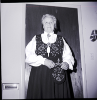 KEL 518 Ingrid Christensen from Tonsberg, Norway, visits her relatives, Mr. and Mrs. Olaf Halverson, in Twin Falls. She is dressed in an authentic Norwegian costume, worn in Valders County, Norway, for special holidays.