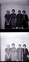 KEL 521 Four officers of the Magic Valley Iris Society stand in a hallway. From left to right are Mrs. C. W. Vallette, president; Mrs. Albert Toberer, vice president; Mrs. Glen Draper, corresponding secretary; and Mrs. Glenn Thietten, recording secretary. All the women are wearing dresses.