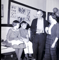 KEL 520 Dilettante lead players Lynette Berry, Mark Herzinger, James LaGrone, and Mrs. Marty Mead meet for a cast call. Lynette Berry, seated on a counter and wearing a dress, holds the score for "The Music Man," and Mark Herzinger, wearing a patterned shirt and slacks, sits beside her. James LaGrone and Mrs. Mead, dressed in shirts, sweater jackets, and slacks, hold Styrofoam cups. Some pictures of different leaves are on the bulletin board on the wall behind them. Some balloons are in the corner of the room.