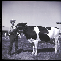 KEL 523 4-H leader Reed Lewis, dressed in a cowboy hat, stands beside the largest cow at the Minidoka County Fair cattle show, holding onto a bridle around its head. The Holstein cow weighs 2,159 pounds. Other people and cows are in the background.