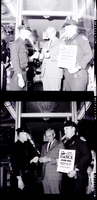 KEL 529 Rudy Ashenbrener buys a ticket to the annual TFPD Policeman's Ball from Patrolman Jerry Packer. Patrolman Gary Bates holds up a sign reading "Annual Policeman's Dance, Legion Hall, November 24, 1965, 9:00 p.m. - 1:00 a.m. Music by the M.C.'s. Admission $1.00." Mr. Ashenbrener is dressed in a suit and tie and the officers are wearing their uniforms. A gymnasium with a basketball hoop overhead is seen in the background.