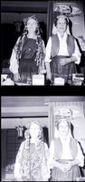 Federation of Women's Clubs in Athens, Greece, at the 20th Century Club luncheon meeting. Mrs. Hawes is wearing a Spanish costume and Mrs. Wilson is wearing a Greek costume. On the table in front of them are several books, antiques, and a photo album. Behind them hangs a poster with a camel on it.