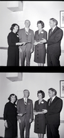 KEL 512 From left to right, Mrs. Ruth Bondurant, president of the Idaho Social Welfare Conference; Dr. John A. Pennock, professor of sociology at Utah State University; Zoe Ann Shaub, Twin Falls County Probate Judge; and Ernest W. Hartung, president of the University of Idaho, attend the Idaho Social Welfare Conference held at the American Legion Hall in Twin Falls. Mrs. Bondurant is dressed in a jacket and skirt and holding some papers. The two men are dressed in suits and ties, and Zoe Ann Shaub is wearing a dress. A picture hangs on the wall behind them.