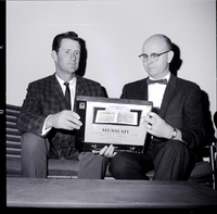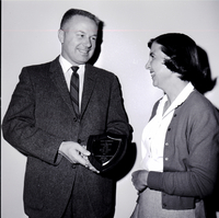 KEL 517 Boyd R. Lowe, director of guidance for Twin Falls School District No. 411, is awarded a plaque for outstanding community service by Mrs. James Bondurant, outgoing president of the Idaho Conference on Social Welfare. The plaque reads "Idaho Conference on Social Welfare Award, Boyd Lowe, For Outstanding Community Service, Twin Falls, 1965." Mr. Lowe is dressed in a suit and tie and Mrs. Bondurant is wearing a blouse, jacket, and skirt.