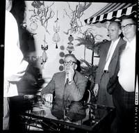 KEL 504 Vardis Fisher signs copies of his book "Mountain Man" at Sallie's Gifts & Books in Twin Falls. He is seated at a table and Twin Falls City Manager H. L. Derrick sits beside him, getting his book signed. On the shelves behind him are copies of the book and various antiques and gift items.