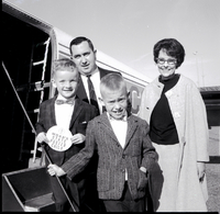 KEL 502 Richard Messersmith, Muscular Dystrophy publicity chairman, and Mrs. Clifton Peterson, Magic Valley Muscular Dystrophy campaign chairman, stand behind Idaho Muscular Dystrophy campaign poster boys Grant and Douglas Jacobsen as they board a plane for Boise. The boys will visit Governor Robert E. Smylie while in Boise. Grant Jacobsen holds a sign reading "MDAA's State Poster Child." The boys are wearing bow ties, slacks, and jackets. Mr. Messersmith is wearing a suit and tie and Mrs. Peterson is wearing a blouse, skirt, and long jacket.