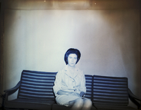 KEL 491 Mrs. Frank Walton, president of the Mary Davis Art Club, sits on a couch. She is wearing a patterned dress. A purse sits beside her on the couch.