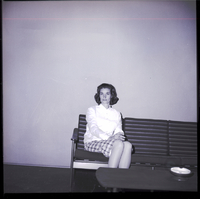 KEL 488 Mrs. Russell Smedley, president of the Modern Mrs. Club, sits on a couch. She is wearing a white blouse and a plaid skirt. There is a table in front of the couch, and on the table is an ash tray.