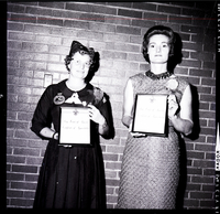 KEL 501 Displaying special award certificates presented them during ceremonies marking the annual Snake River Area Council Boy Scout Leaders Recognition Banquet held at Twin Falls High School are, from left to right, Mrs. Clark Torell, den mother for Cub Scout Pack 93, and Mrs. James Fisher, who has been in the scouting program for eight years. Mrs. Fisher is wearing her uniform and a corsage, and Mrs. Torell is wearing a dress and a corsage. The certificates read "Boy Scouts of America Certificate of Appreciation."