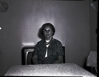 KEL 493 Mrs. Emma Steffen, president of the Amoma Class at the First Baptist Church, sits on a couch. She is wearing a checkered dress and jacket.