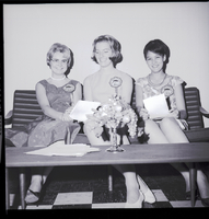 KEL 498 From left to right, new TFHS FHA chapter officers Kay Ihler, Christy Closner, and Angela Abundis sit on a couch. The three girls are all wearing dresses and badges that read "Future Homemakers of America Toward New Horizons." They are holding some papers. On the coffee table in front of the couch is a stack of papers and a centerpiece of fruits and flowers.