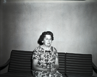 KEL 483 Mrs. Earl Shobe, oracle of the Vishnu Camp No. 2970 of the Twin Falls Royal Neighbors of America, sits on a couch. She is wearing a floral print dress.