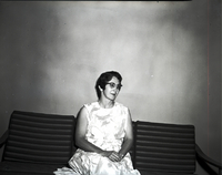 KEL 479 Mrs. Wesley Sonius, president of the Merry Marrieds, sits on a couch. She is wearing a sleeveless dress.