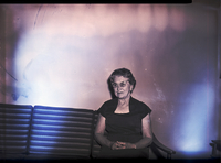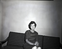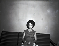 KEL 477 Mrs. Lynn Popplewell, president of the Cheerful Matrons, sits on a couch. She is wearing a dress.