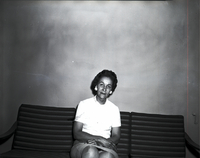 KEL 474 Mrs. Nedra Gentry, president of the Community Y Wives, sits on a couch. She is wearing a white shirt and black skirt.