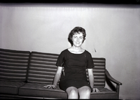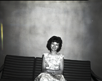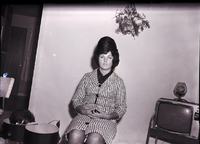 KEL 469 Mrs. Ronnie Pope, president of the Magic Valley Young Wives, sits on a couch. She is wearing a floral print dress. A purse sits beside her on the couch.