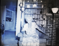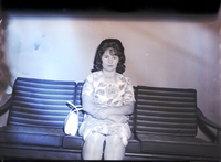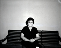 KEL 464 Mrs. Morris Vavold, president of the Nazarene World Missionary Society of the Twin Falls First Nazarene Church, sits on a couch. She is wearing a blouse, jacket, and skirt. A package sits on her lap.