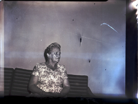 KEL 462 Mrs. Althea Tyler, president of the Mary Martha Class of the First Baptist Church, sits in a chair. She is wearing a patterned dress. A framed image of some sheep on a plain hangs on the wall above her.