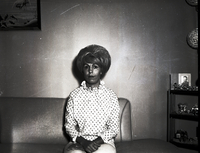 KEL 468 Mrs. Bob Leab sits on a chair, modeling a wig. She is wearing a checkered dress. Another wig is in a round container on the floor. To the right is a television. A flower ornament hangs on the wall above her. A chair and another room is seen through a doorway to the left.