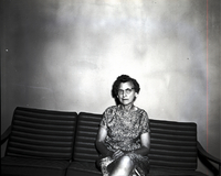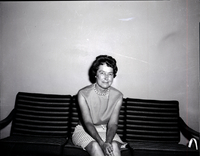 KEL 467 Mrs. William C. Armga, president of the Past Oracles Club, sits on a couch. She is wearing a floral print dress.