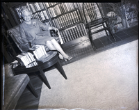 KEL 381 Mrs. John Hayes, president of the Twin Falls Ascension Guild of the Episcopal Church, sits in a recliner in a study. She is wearing a dress suit with a flower embroidered on the jacket. A bookcase is behind her, and beside her is a round table covered in books and a love seat. A fireplace is in the corner, and beside it are a vase and chair.