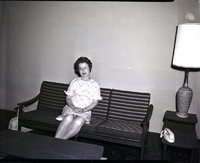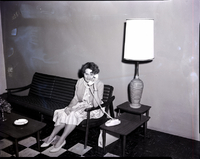 KEL 374 Mrs. Earl Boylen, president of the Twin Falls Business and Professional Women's Club, sits on a striped couch, holding a telephone. She is wearing a striped dress with a jacket. On the stand beside the couch is the telephone cradle and a lamp. A purse sits on the floor. On the table in front of the couch is a centerpiece of fruit and an ash tray.