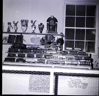 KEL 372 Several shelves of toy trains are on display at the Twin Falls County Fair. Underneath them is a sign reading "Toy Train Display - 1925-1947. Trains of yesterday electric and windup. Your real old trains wanted for my collection! Donations gladly accepted! Purchases also made. C. Dudley Twin Falls, Idaho." Some shelves above have some antique books, fans, vases, and clocks on display, and some of them have award ribbons hanging from them.