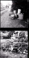KEL 368 In the top image, some garbage cans and boxes are piled underneath a tree in an alley. On the other side of the road, weeds grow along the side of a fence, and a house and trees are in the background. In the bottom image, dead weeds, wire, tin cans, boxes, and wooden crates are piled up. Behind the junk, some trees and a house are in the background. A cleanup campaign of Twin Falls alleys is planned.