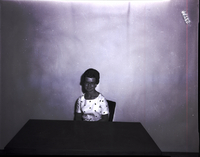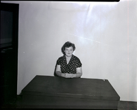 KEL 375 Mrs. Robert Brackett, president of the Twin Falls Baptist Women's Mission Society, stands against a wall. She is wearing a floral print dress and a hat. A table is in front of her, and a chair is in the corner of the room.