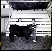 KEL 371 A young girl wearing a striped shirt and pants holds the bridle for her black Angus cow, which won the junior Angus show at the Twin Falls County Fair. A woman stands beside her, handing her a dish. Some empty bleachers are behind them.