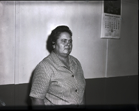 KEL 377 Mrs. Melvin Eslinger, president of the Twin Falls Christian Women's Fellowship of the First Christian Church, stands against a wall. She is wearing a striped button-up blouse. A calendar for the Union Pacific Railroad hangs from the wall.