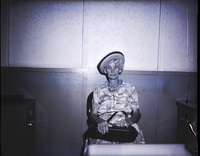 KEL 378 Mrs. Ruby Smith, president of the ladies auxiliary to the United Spanish War Veterans, sits in a chair against a wall. She is wearing a dress and hat, and is holding a purse in her lap. Some file cabinets are on either side of her.