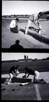 KEL 280 In the top image, Dave Wanzenried, left, and Dennis Samples, right, paint the curb in front of Twin Falls High School as a school service project by the Interact Club. The Interact Club, who are sponsored by the Rotary Club, plan to erect a marquee to announce school events for their next service project. The high school building, part of the parking lot, and some houses are visible in the background.