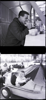 KEL 284 In the top image, Dennis Fowler, dressed in a hooded jacket, enjoys a hamburger at the Twin Falls County Fair. On the table in front of him is a glass bottle of soda, a Tupperware container of sliced tomatoes, and a pair of sunglasses. In the bottom image, a little girl sits inside a car, holding the steering wheel, in a carnival ride.