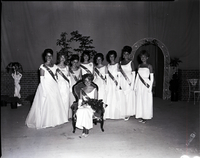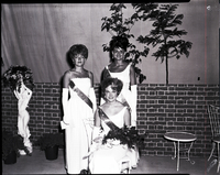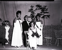 KEL 226 Cheryl Couch, winner of the Miss Twin Falls pageant, is seated and holding a bouquet of roses, while runners-up Pamela Jones and Deanna Peterson stand behind her with a man. The event was sponsored by the Twin Falls Lions Club and held at the Twin Falls High School gymnasium. The women are dressed in formal gowns and sashes, and Cheryl Couch wears a tiara. The man wears a tuxedo with a bow tie and has a corsage in his jacket. Some potted plants, a statue holding a flower arrangement, and a table and chair are in the background.