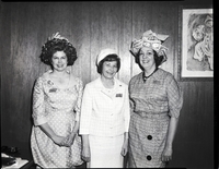 KEL 048 Attending the Welcome Wagon Newcomers Club April Fool's Day hat revue are, from left to right, Mrs. L. J. Robertson, president, Mrs. L. E. Hinton, Welcome Wagon hostess, and Mrs. Richard Dixon, out-going treasurer. Mrs. Robertson, dressed in a polka dot dress, wears a hat of black crepe paper with white signs sticking out of it reading "Pharmacy," "Bank & Trust," "Oil Co.," and "Texaco." Mrs. Hinton is dressed in a plaid dress suit and white bonnet. Mrs. Dixon, dressed in a striped dress, wears a hat covered in fake paper money and various bills and invoices. They are standing beside a table that has some ashtrays, paper, and a wallet on it. On the wall behind them hangs a painting of a clown.