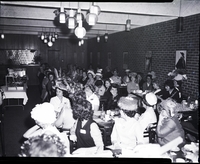 KEL 046 Guest speaker Mrs. Esther Allred, a custom hat designer, spoke on hat making techniques and described many of the latest fashions at the Welcome Wagon Newcomers Club luncheon meeting held at the Depot Grill Caboose room. Mrs. Allred stands behind a microphone, and there is a box and several hats sitting on a table beside her. She holds up a hat, displaying it as she speaks. Attendees seated at long tables enjoy food and coffee during the talk. A jukebox and an open closet are in the background. Several art prints hang on the brick wall.