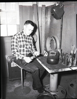 KEL 003 Norman Kessler, vocational agriculture instructor at Kimberly High School, checks some welding equipment. He has a welding tool in his hand and is working on a piece of metal in a workshop in the vocational agriculture building at Kimberly High School. A welding mask sits on the table. Mr. Kessler will teach an adult course in arc welding and cutting, sponsored by the school district.