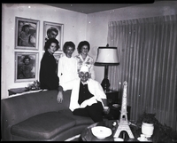 KEL 008 A group of ten people are gathered at a bon voyage party held in honor of the Coiners before their trip to Europe. From left to right are Robert Denton, Robert Bralisford, Mrs. Garland Gibbs, Jerome Wilson, Mrs. Robert Bralisford, George Coiner, Mrs. J. P. Seabeck, and J. P. Seabeck. Mr. Gibbs and Mr. Bralisford are wearing French berets, Mrs. Gibbs is wearing a German dress, Mr. Wilson is wearing a Spanish sombrero, Mrs. Bralisford holds a guitar, and Mr. Seabeck wears a Turkish fez hat. In front of the group a man and a woman wearing German hats kneel beside a glass coffee table. A scale model of the Eiffel Tower sits on a table as a decoration.