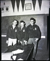 KEL 002 Twin Falls FFA members Mike Quesnell, Lyle Fuller, and Terry Sullivan stand beside a second place award trophy for the South Magic Valley district FFA weed contest held in Castleford. The boys stand in a welding classroom, and are wearing embroidered FFA jackets. Award banners for livestock judging, crops contest, and milk products contest hang along the top wall.