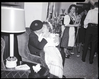 KEL 006 Garland Gibbs kisses Mrs. Garland Gibbs at a bon voyage party held in honor of the Coiners before their trip to Europe. Mr. Gibbs is dressed in a French beret, and Mrs. Gibbs wears a German dress. Mrs. Robert Denton, dressed in a German dress, stands in the background holding Alpine ski poles.