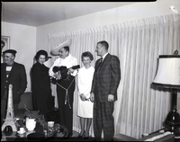 KEL 005 Mr. and Mrs. George Coiner stand beside a cabinet that has a sign reading "Germany" at a bon voyage party held in their honor before their trip to Europe. A painting, tea set, and doll sit on top of the cabinet.