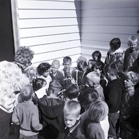 - Mrs. Cleo Shorthouse's kindergarten classes visit the Kenneth Walker farm. A group of children surround a birdcage, looking at the Quaker parrot shown by Mrs. Kenneth Walker. Behind them is a house.
