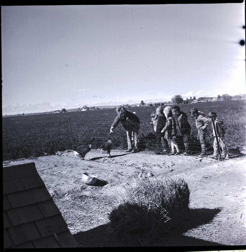 - Mrs. Cleo Shorthouse's kindergarten classes visit the Kenneth Walker farm. A group of children watch two geese inside a pen. A woman bends over the wire fence, feeding a goose. A metal bucket and a bale of hay are inside the pen. Fields stretch out into the distance.
