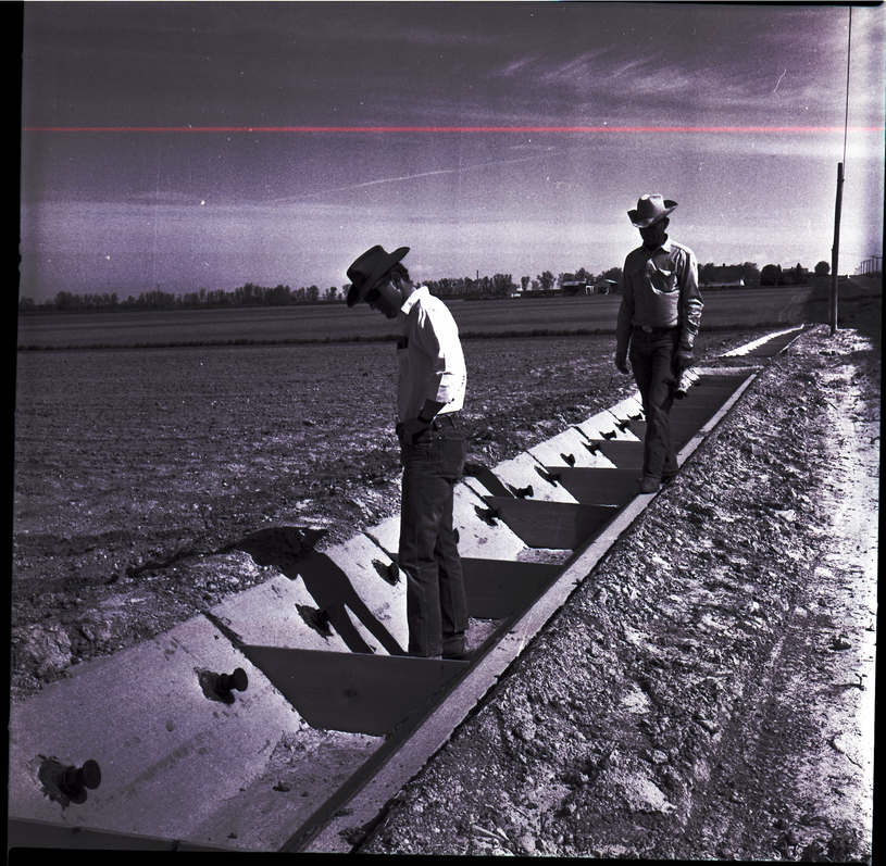 Peter Link Jr. and Lee McCoy look over a new type of irrigation system in a field on a farm south of Hansen. This system, the first of its kind in the area, is a concrete-lined ditch with plastic tubing for each corrugate set in the concrete. The farmers are wearing cowboy hats. Fields stretch out into the distance, and trees and houses line the horizon.