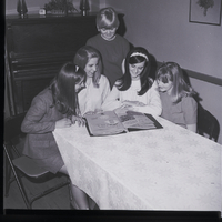 Attending Girls State at Northwest Nazarene College in Nampa, from Twin Falls, are from left to right, Susan Billington, Barbara Barker, Kathy Lincoln, Cynthia Ronk, and Paula Hawks. These girls were found outstanding in leadership, character, courage, honesty, scholarship, cooperativeness, and physical fitness by the Twin Falls High School faculty and the American Legion Auxiliary of Twin Falls. The five girls sit around a table looking at a scrapbook. The table is covered in a white tablecloth. Against the back wall is a piano. On top of the piano is a small clock, a centerpiece of a basket of silk flowers, and some lamps. A picture of a bouquet of flowers hangs on the side wall.