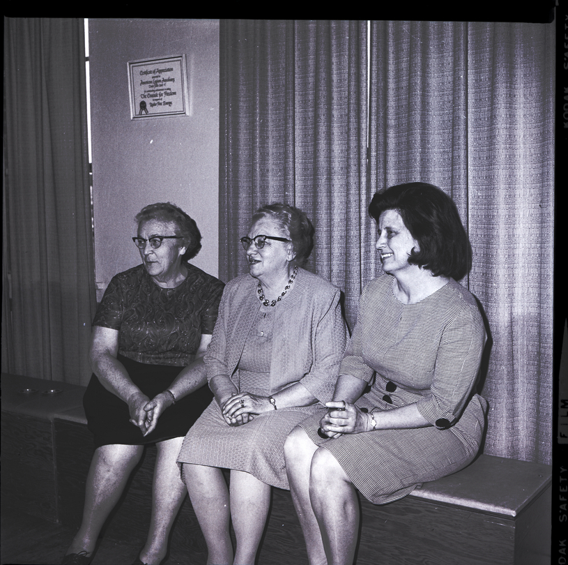 The annual Syringa Club Girls State sessions are sponsored by the American Legion Auxiliary. This year Mrs. W. W. Noble, center, served as Girls State chairman for Twin Falls, assisted by Mrs. H. L. Wurst, left, and Mrs. L. James Koutnik. Long curtains cover the windows behind them. A framed certificate hangs on the wall.