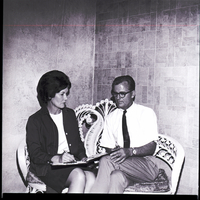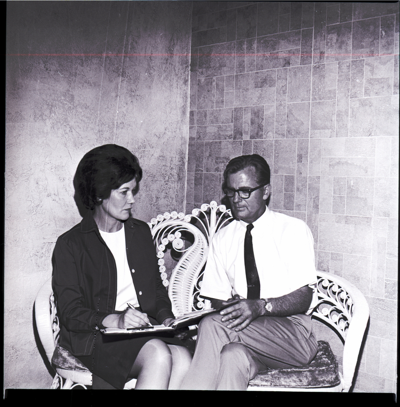 Interior decorator Jane Wilson and A. B. Parker, new owner of the Castillian Coiffures beauty salon in Twin Falls, sit on a bench looking over a booklet of interior design options for the new shop, which is done in a Spanish motif.