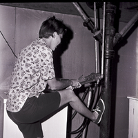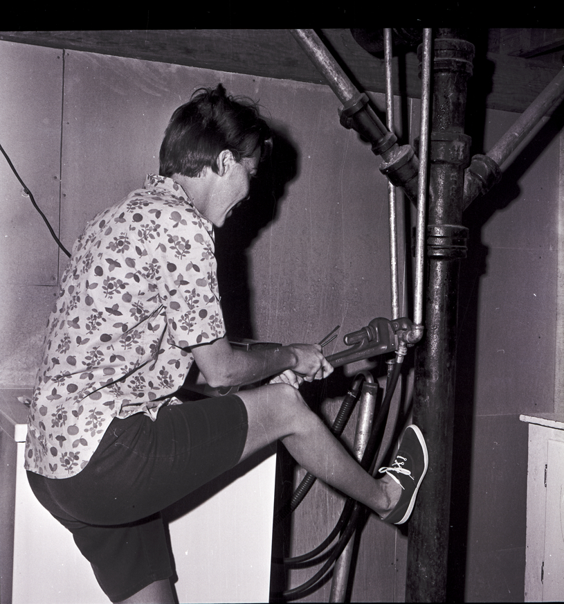 A member of the YWCA-sponsored Military Waiting Wives Club works on some pipes with a wrench in a basement.