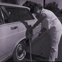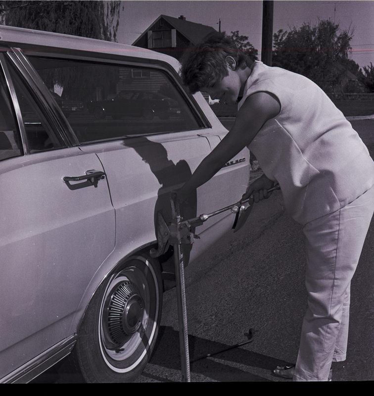 A member of the YWCA-sponsored Military Waiting Wives Club raises a car up on a jack to change a tire. In the background, houses, lawns, and trees are visible.